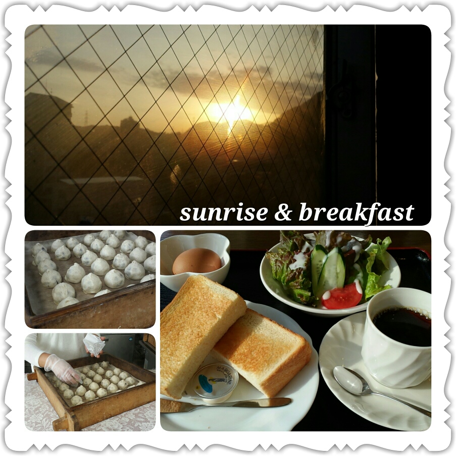 朝陽を窓から眺め、