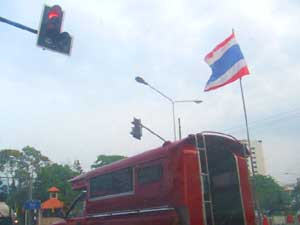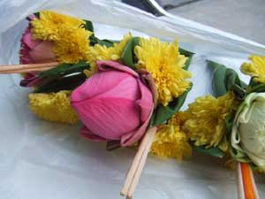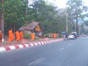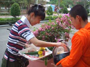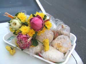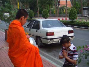 以前からバンコクの街中でも良く見かけるお坊様にお供えする様子。
